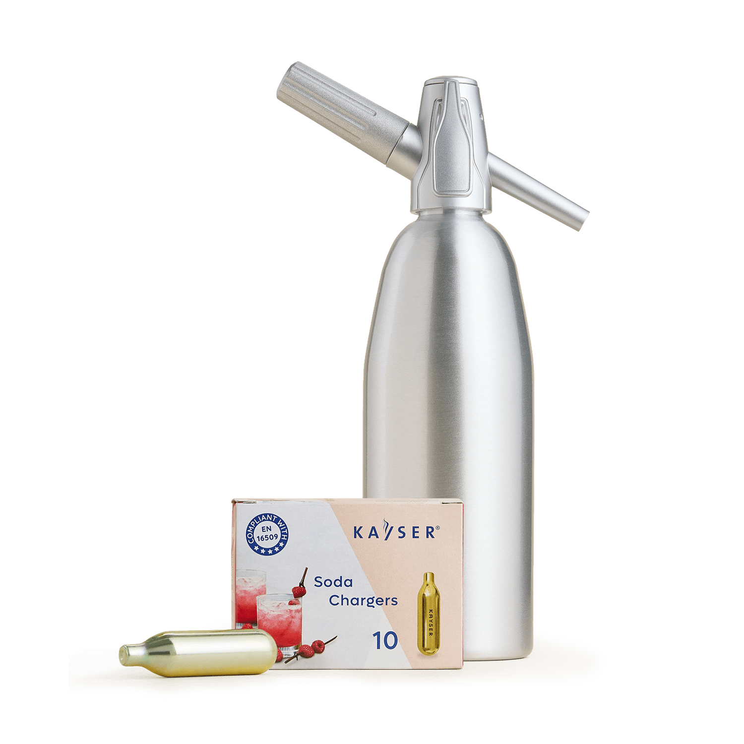 Fill a 1-quart soda siphon with 24 oz of cold water (about ¾ full). Charge with 1 CO₂ cartridge and shake vigorously to carbonate.